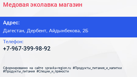 Медовая эколавка, магазин по адресу Дагестан, Дербент, Айдынбекова, 2Б в дальнейшем Организация, размещена в следующих категориях:
