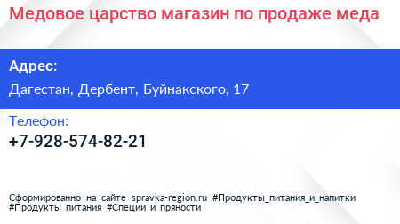 Медовое царство, магазин по продаже меда по адресу Дагестан, Дербент, Буйнакского, 17 в дальнейшем Организация, размещена в следующих категориях: