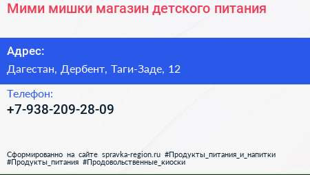 Мими мишки, магазин детского питания по адресу Дагестан, Дербент, Таги-Заде, 12 в дальнейшем Организация, размещена в следующих категориях: