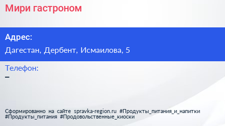 Мири, гастроном по адресу Дагестан, Дербент, Исмаилова, 5 в дальнейшем Организация, размещена в следующих категориях: