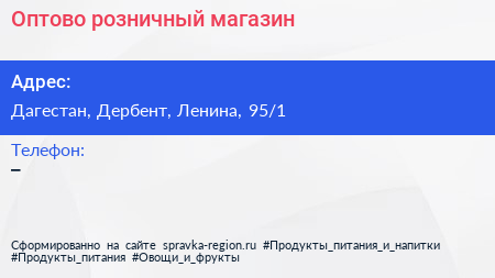 Оптово-розничный магазин по адресу Дагестан, Дербент, Ленина, 95/1 в дальнейшем Организация, размещена в следующих категориях: