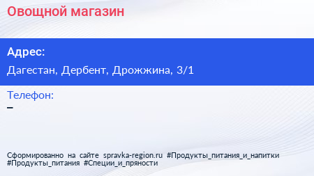 Овощной магазин по адресу Дагестан, Дербент, Дрожжина, 3/1 в дальнейшем Организация, размещена в следующих категориях: