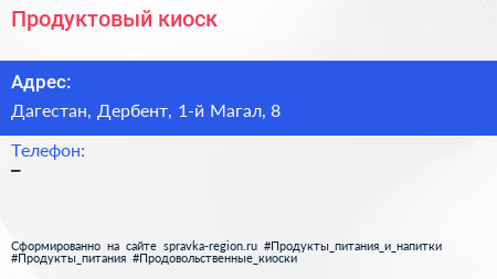 Продуктовый киоск по адресу Дагестан, Дербент, 1-й Магал, 8 в дальнейшем Организация, размещена в следующих категориях: