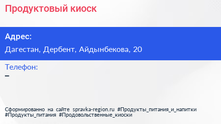 Продуктовый киоск по адресу Дагестан, Дербент, Айдынбекова, 20 в дальнейшем Организация, размещена в следующих категориях: