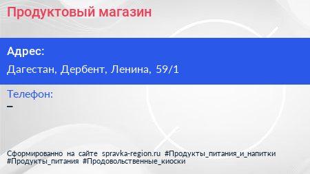 Продуктовый магазин по адресу Дагестан, Дербент, Ленина, 59/1 в дальнейшем Организация, размещена в следующих категориях: