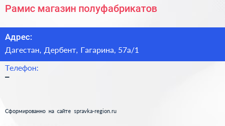Рамис, магазин полуфабрикатов по адресу Дагестан, Дербент, Гагарина, 57а/1 в дальнейшем Организация, размещена в следующих категориях: