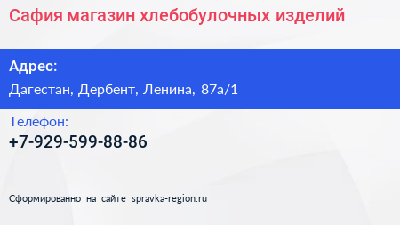 Сафия, магазин хлебобулочных изделий по адресу Дагестан, Дербент, Ленина, 87а/1 в дальнейшем Организация, размещена в следующих категориях: