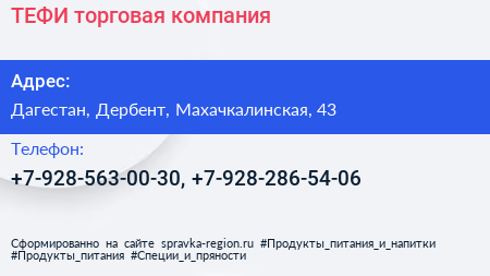 ТЕФИ, торговая компания по адресу Дагестан, Дербент, Махачкалинская, 43 в дальнейшем Организация, размещена в следующих категориях: