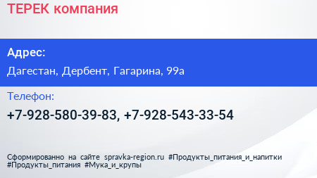 ТЕРЕК, компания по адресу Дагестан, Дербент, Гагарина, 99а в дальнейшем Организация, размещена в следующих категориях: