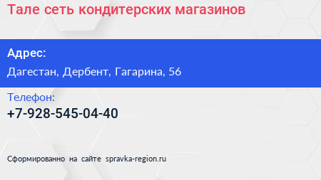 Тале, сеть кондитерских магазинов по адресу Дагестан, Дербент, Гагарина, 56 в дальнейшем Организация, размещена в следующих категориях: