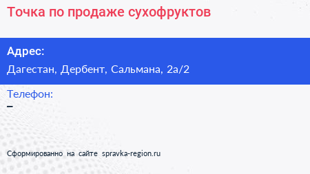 Точка по продаже сухофруктов по адресу Дагестан, Дербент, Сальмана, 2а/2 в дальнейшем Организация, размещена в следующих категориях:
