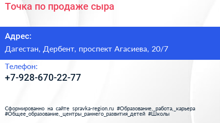 Точка по продаже сыра по адресу Дагестан, Дербент, проспект Агасиева, 20/7 в дальнейшем Организация, размещена в следующих категориях: