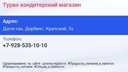 Туран, кондитерский магазин по адресу Дагестан, Дербент, Крупской, 7а в дальнейшем Организация, размещена в следующих категориях: