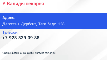 У Валиды, пекарня по адресу Дагестан, Дербент, Таги-Заде, 128 в дальнейшем Организация, размещена в следующих категориях: