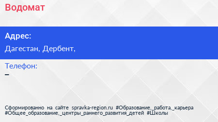 Водомат по адресу Дагестан, Дербент, в дальнейшем Организация, размещена в следующих категориях: