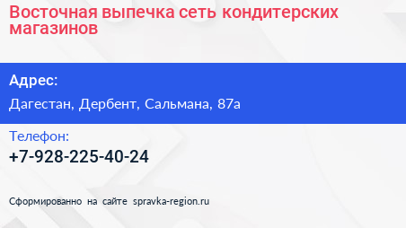 Восточная выпечка, сеть кондитерских магазинов по адресу Дагестан, Дербент, Сальмана, 87а в дальнейшем Организация, размещена в следующих категориях: