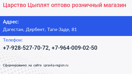 Царство Цыплят, оптово-розничный магазин по адресу Дагестан, Дербент, Таги-Заде, 81 в дальнейшем Организация, размещена в следующих категориях: