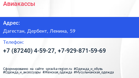 Авиакассы по адресу Дагестан, Дербент, Ленина, 59 в дальнейшем Организация, размещена в следующих категориях: