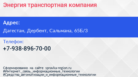 Энергия, транспортная компания по адресу Дагестан, Дербент, Сальмана, 65Б/3 в дальнейшем Организация, размещена в следующих категориях: