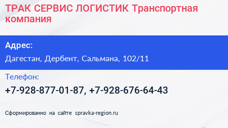 ТРАК-СЕРВИС-ЛОГИСТИК, Транспортная компания по адресу Дагестан, Дербент, Сальмана, 102/11 в дальнейшем Организация, размещена в следующих категориях: