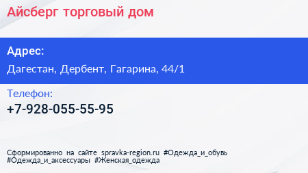 Айсберг, торговый дом по адресу Дагестан, Дербент, Гагарина, 44/1 в дальнейшем Организация, размещена в следующих категориях: