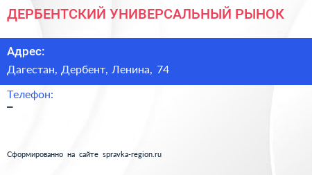 ДЕРБЕНТСКИЙ УНИВЕРСАЛЬНЫЙ РЫНОК по адресу Дагестан, Дербент, Ленина, 74 в дальнейшем Организация, размещена в следующих категориях: