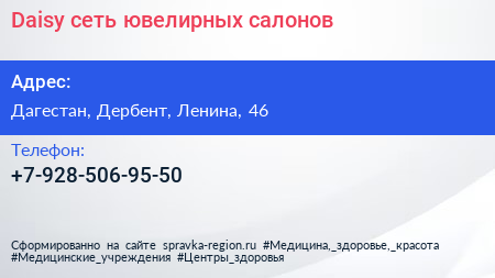 Daisy, сеть ювелирных салонов по адресу Дагестан, Дербент, Ленина, 46 в дальнейшем Организация, размещена в следующих категориях: