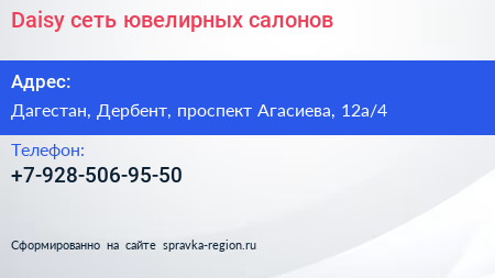 Daisy, сеть ювелирных салонов по адресу Дагестан, Дербент, проспект Агасиева, 12а/4 в дальнейшем Организация, размещена в следующих категориях: