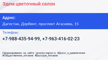 Эдем, цветочный салон по адресу Дагестан, Дербент, проспект Агасиева, 15 в дальнейшем Организация, размещена в следующих категориях: