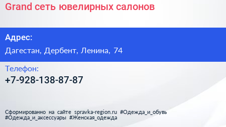 Grand, сеть ювелирных салонов по адресу Дагестан, Дербент, Ленина, 74 в дальнейшем Организация, размещена в следующих категориях: