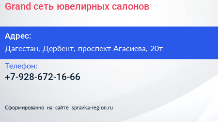 Grand, сеть ювелирных салонов по адресу Дагестан, Дербент, проспект Агасиева, 20т в дальнейшем Организация, размещена в следующих категориях: