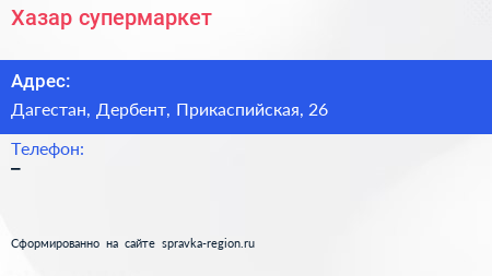 Хазар, супермаркет по адресу Дагестан, Дербент, Прикаспийская, 26 в дальнейшем Организация, размещена в следующих категориях: