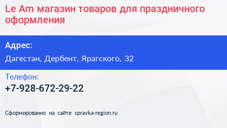 Le & Am, магазин товаров для праздничного оформления по адресу Дагестан, Дербент, Ярагского, 32 в дальнейшем Организация, размещена в следующих категориях: