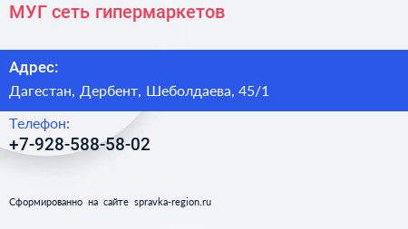 МУГ, сеть гипермаркетов по адресу Дагестан, Дербент, Шеболдаева, 45/1 в дальнейшем Организация, размещена в следующих категориях: