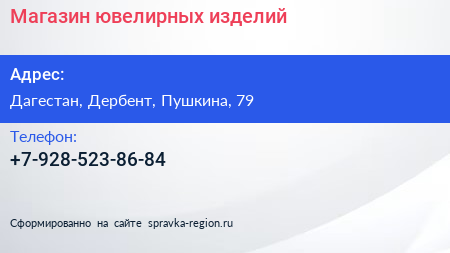 Магазин ювелирных изделий по адресу Дагестан, Дербент, Пушкина, 79 в дальнейшем Организация, размещена в следующих категориях: