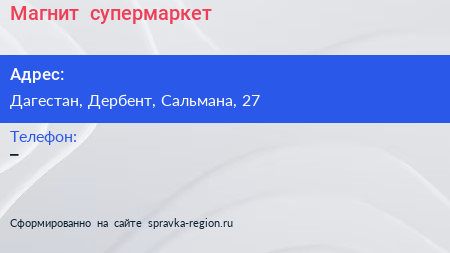 Магнит+, супермаркет по адресу Дагестан, Дербент, Сальмана, 27 в дальнейшем Организация, размещена в следующих категориях: