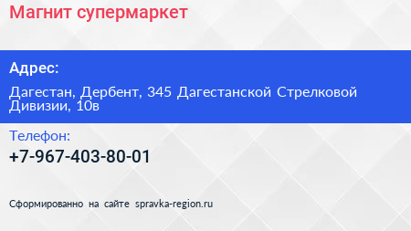 Магнит, супермаркет по адресу Дагестан, Дербент, 345 Дагестанской Стрелковой Дивизии, 10в в дальнейшем Организация, размещена в следующих категориях: