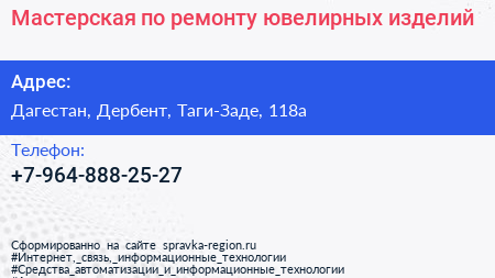 Мастерская по ремонту ювелирных изделий по адресу Дагестан, Дербент, Таги-Заде, 118а в дальнейшем Организация, размещена в следующих категориях: