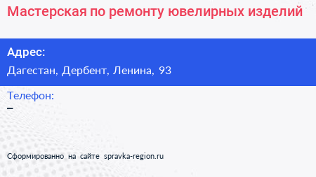Мастерская по ремонту ювелирных изделий по адресу Дагестан, Дербент, Ленина, 93 в дальнейшем Организация, размещена в следующих категориях: