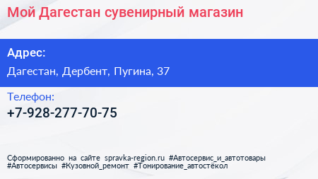 Мой Дагестан, сувенирный магазин по адресу Дагестан, Дербент, Пугина, 37 в дальнейшем Организация, размещена в следующих категориях: