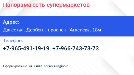Панорама, сеть супермаркетов по адресу Дагестан, Дербент, проспект Агасиева, 18м в дальнейшем Организация, размещена в следующих категориях: