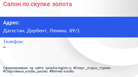 Салон по скупке золота по адресу Дагестан, Дербент, Ленина, 89/1 в дальнейшем Организация, размещена в следующих категориях: