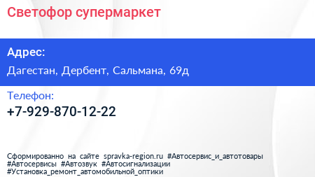 Светофор, супермаркет по адресу Дагестан, Дербент, Сальмана, 69д в дальнейшем Организация, размещена в следующих категориях: