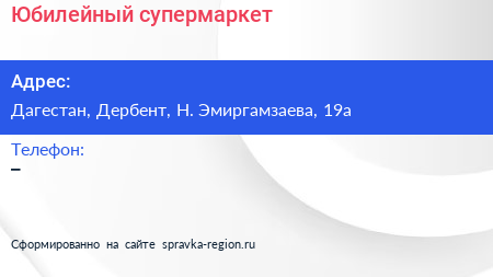 Юбилейный, супермаркет по адресу Дагестан, Дербент, Н. Эмиргамзаева, 19а в дальнейшем Организация, размещена в следующих категориях: