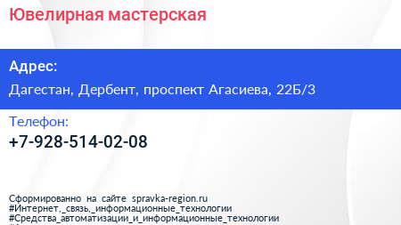 Ювелирная мастерская по адресу Дагестан, Дербент, проспект Агасиева, 22Б/3 в дальнейшем Организация, размещена в следующих категориях: