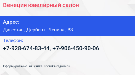 Венеция, ювелирный салон по адресу Дагестан, Дербент, Ленина, 93 в дальнейшем Организация, размещена в следующих категориях: