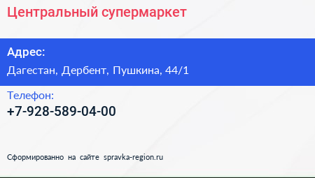 Центральный, супермаркет по адресу Дагестан, Дербент, Пушкина, 44/1 в дальнейшем Организация, размещена в следующих категориях: