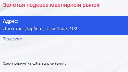 Золотая подкова, ювелирный рынок по адресу Дагестан, Дербент, Таги-Заде, 102 в дальнейшем Организация, размещена в следующих категориях: