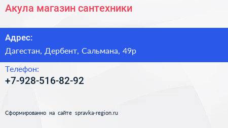 Акула, магазин сантехники по адресу Дагестан, Дербент, Сальмана, 49р в дальнейшем Организация, размещена в следующих категориях: