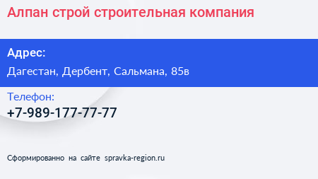 Алпан строй, строительная компания по адресу Дагестан, Дербент, Сальмана, 85в в дальнейшем Организация, размещена в следующих категориях: